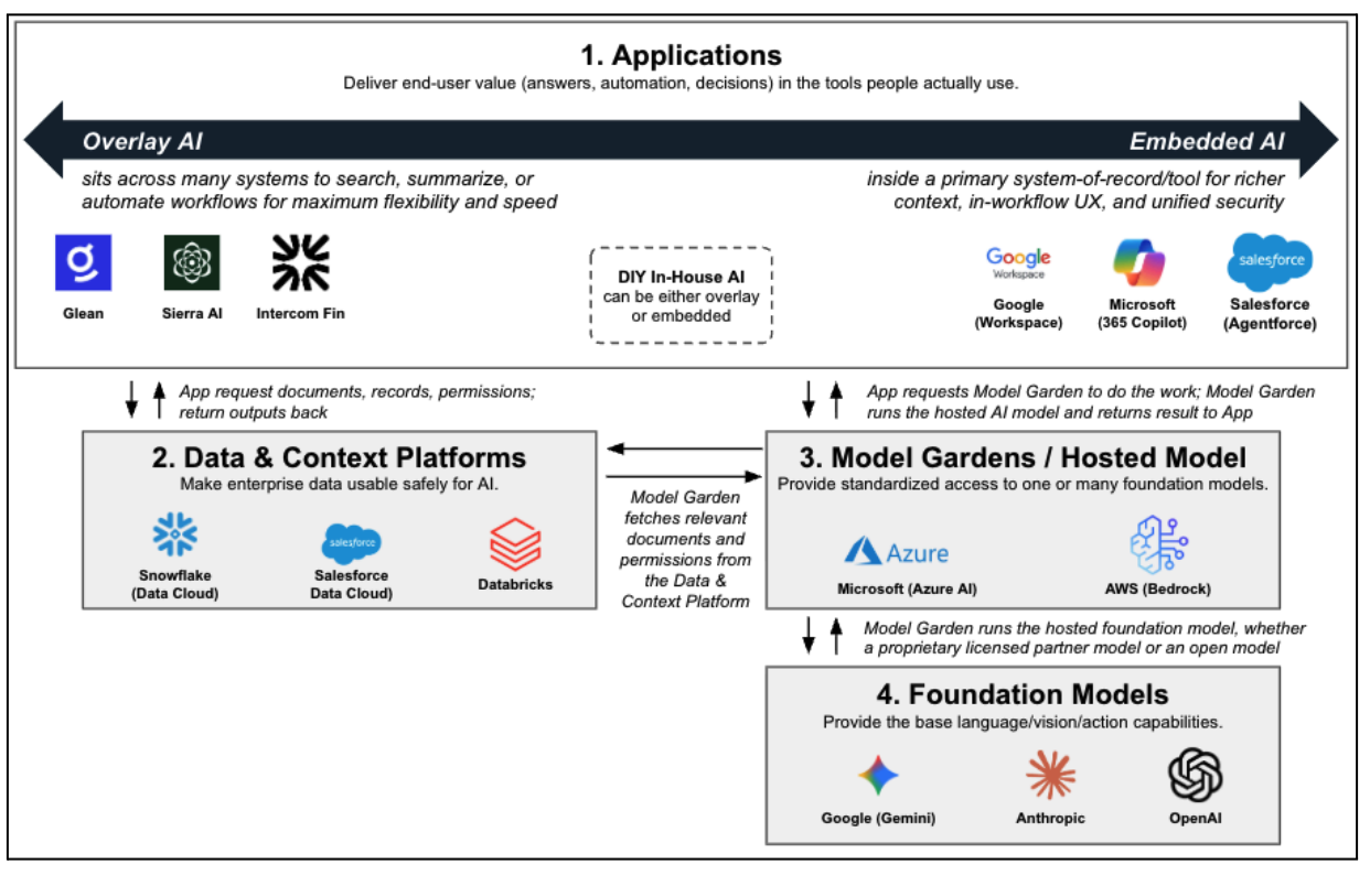 En nuestro análisis de arquitecturas superpuestas e integradas, nos centramos exclusivamente en la capa de aplicación, donde los usuarios finales obtienen valor a través de respuestas, automatización y soporte para la toma de decisiones. Excluimos el análisis de modelos base, entornos de modelado, plataformas de datos y contexto, y la subcategoría de IA de desarrollo propio. Nuestro enfoque se centra en las ventajas e inconvenientes del diseño entre la IA superpuesta y la IA integrada que se puede adquirir de proveedores de IA.